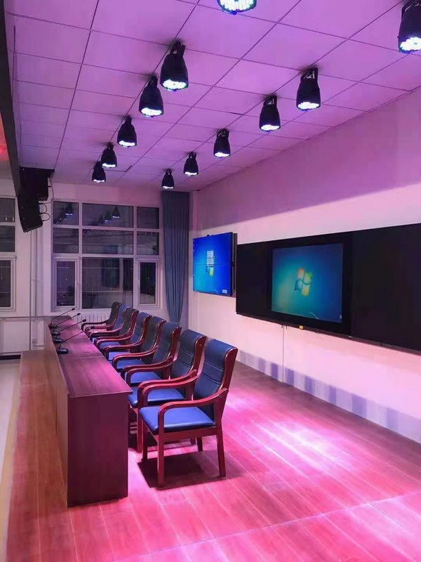 燈光方面,舞臺(tái)上方配置了染色燈,面光燈等,以滿足開會(huì),演出等多種使用功能。